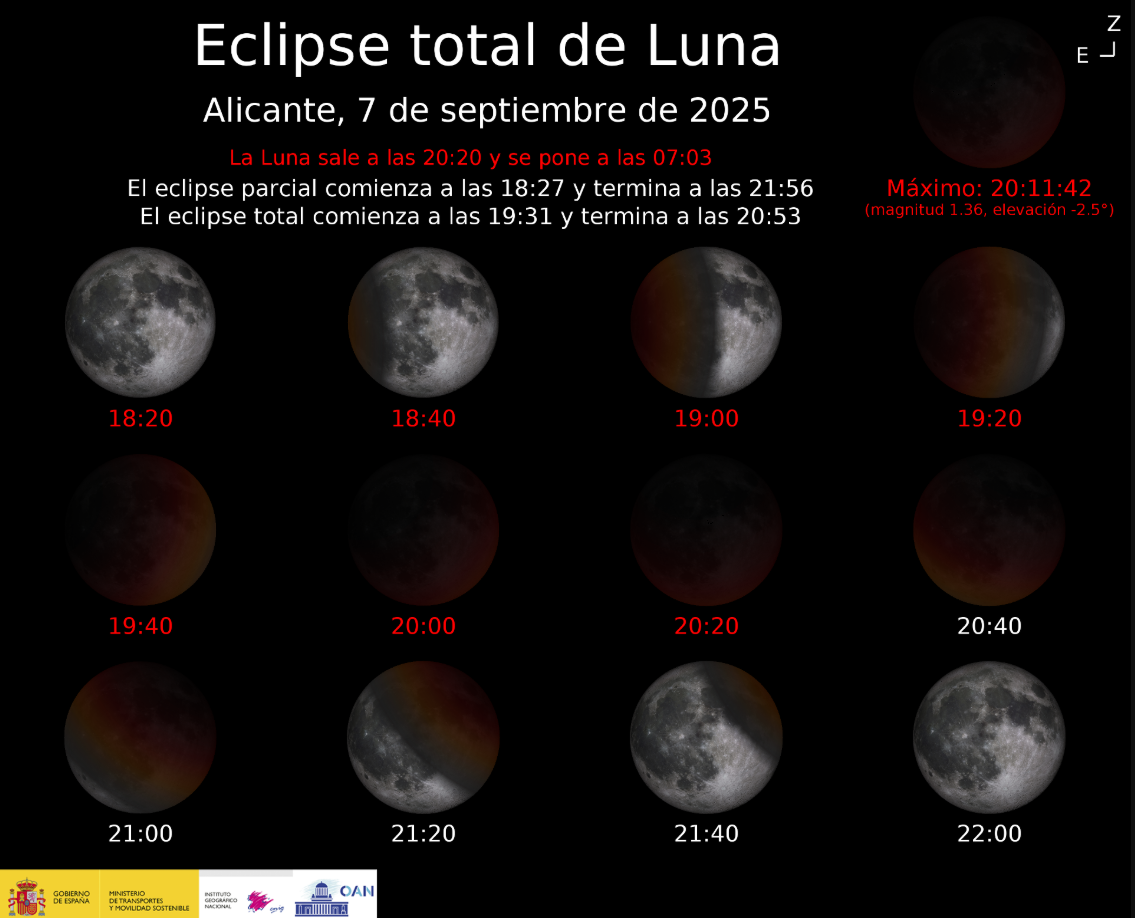 El máximo de totalidad ocurrirá a las 20:10h con la Luna unos 2º por debajo de nuestro horizonte. La Luna saldrá a las 20:20h y a partir de aquí podrá empezar a verse aunque con mucha dificultad. El fin de la totalidad será solo 23 minutos después, con la Luna muy baja en el horizonte, a solo 5º de altura, y aún complicada de ver. Con el inicio de la fase de parcialidad, a las 20:53h, la luz irá ganado terreno poco a poco y el eclipse finalizara a las 21:56h con la Luna a 17º de altura.