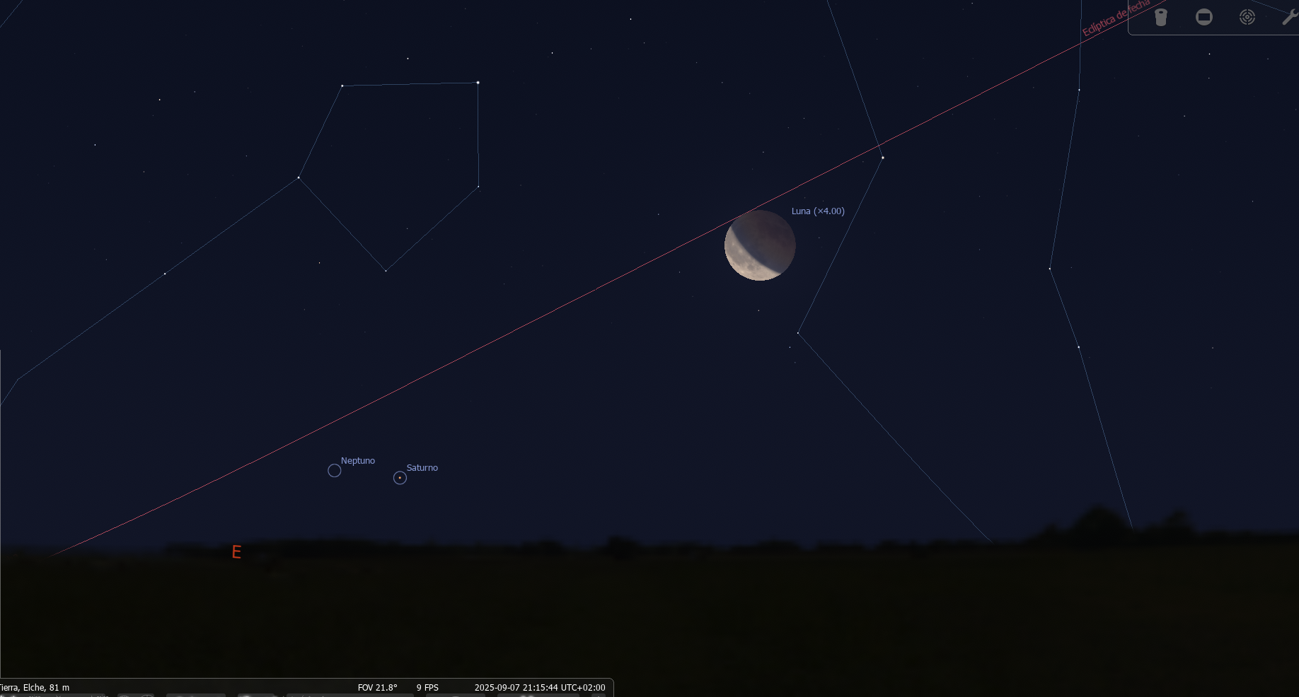 Para que os hagáis una mejor idea de qué se verá os dejamos una simulación del eclipse todavía en la totalidad, a las 20:45h, pero con la Luna muy baja, un momento presumiblemente difícil de ver.